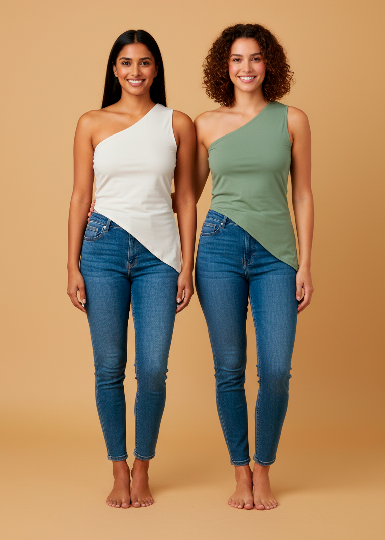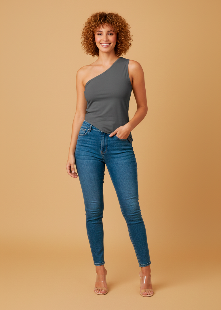 Decote assimétrico que valoriza! Blusa regata de um ombro só em malha de toque macio e caimento fluido na cor Nude/Bege. A peça-chave para um look moderno e chic. Tamanho único.