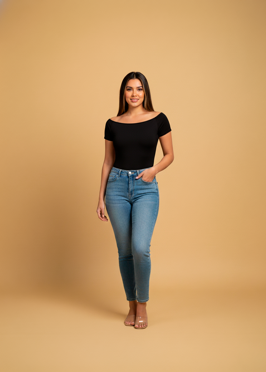Decote canoa elegante que deixa os ombros à mostra. Body preto de manga curta em malha stretch de alta qualidade. Peça essencial que garante caimento perfeito com qualquer parte de baixo. Tamanho único.