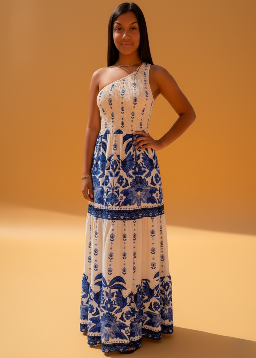 Luxo e conforto em uma só peça. O modelo ombro único com lastex ajusta-se perfeitamente à silhueta, enquanto a estampa inspirada em azulejo português confere um toque de sofisticação atemporal. Tamanho único e veste até o 44.
